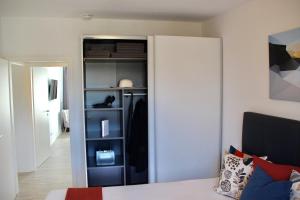 The accommodation comprises two separate bedrooms, one living room furnished with a sofa bed and seating area, as well as one bathroom equipped with a walk-in shower without steps and a hairdryer. The kitchen is fully fitted with modern appliances including an oven, stovetop, refrigerator, dishwasher, coffee machine and toaster alongside complete kitchenware for meal preparation.