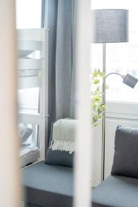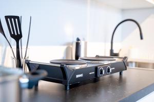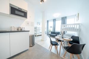 This apartment features a fully equipped kitchen with modern amenities such as a stovetop, refrigerator, microwave, toaster, coffee machine, electric kettle and tea and coffee making facilities alongside dining table space and high chair for children. The separate bedroom provides comfortable sleeping arrangements with six beds including sofa bed options as well as an iron, heating system and non-feather pillows for guest comfort.