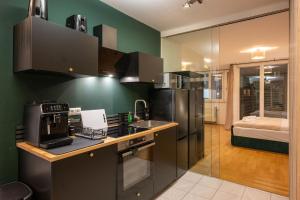 Les convives peuvent préparer leurs repas dans la cuisine entièrement équipée comprenant plaque de cuisson, réfrigérateur, lave-vaisselle, four micro-ondes toaster bouilloire électrique vaisselle machine à café table à manger chaise haute coin cuisine. Un espace repas extérieur est aménagé sur le balcon ou la terrasse où se trouve également une terrasse ensoleillée idéale pour se détendre après une journée d’exploration urbaine. Côté technologie : télévision écran plat avec services streaming dont Netflix prises au niveau du lit accès internet via Wi-Fi gratuit dans toutes les pièces. Les commodités pratiques incluent ascenseur desservant les étages supérieurs check-in/check-out privés détecteurs fumée extincteurs garantissant la sécurité des occupants.